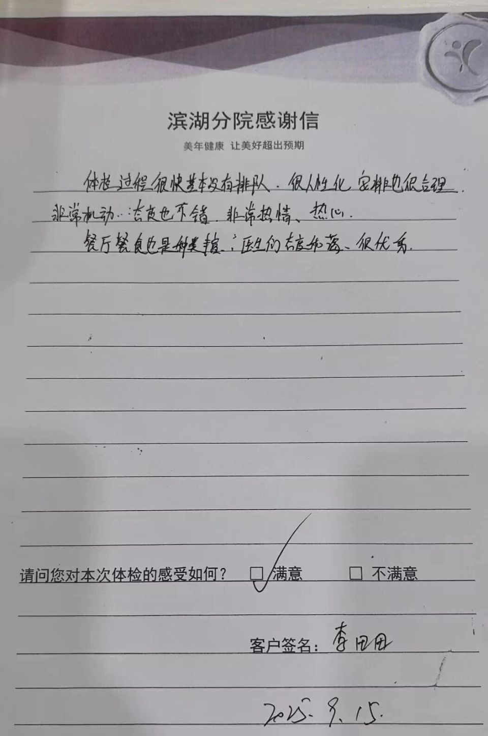 “体检过程很快基本没有排队,很人性化…餐厅餐食也是种类丰富,医生们态度和蔼,很优秀。”—— 来自滨湖分院李女士的体验。