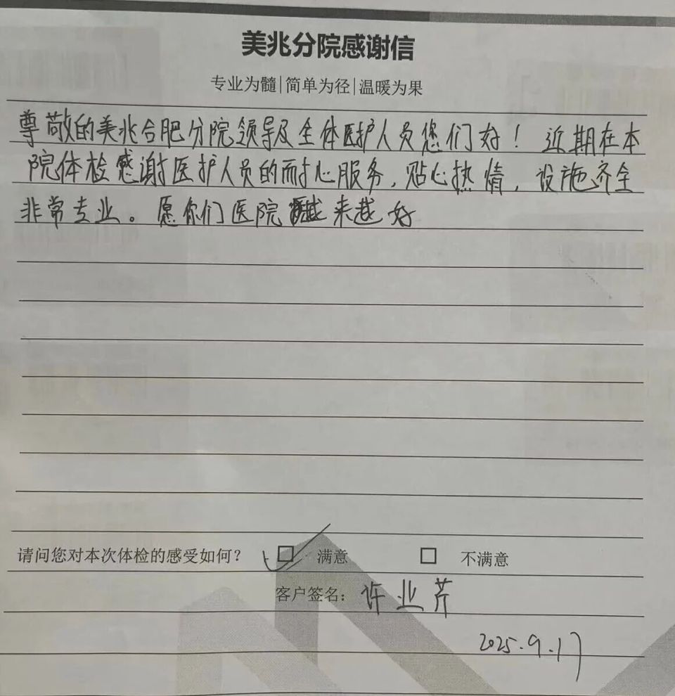 这些真挚的反馈,不仅是对我们工作最好的肯定,也为正在寻找“合肥体检中心推荐” 的朋友们提供了一份最真实的参考。今天,我们便以这些感谢信为窗,带您看看合肥美年大健康在各区的分院,究竟是如何用专业和温暖赢得市民信赖的。