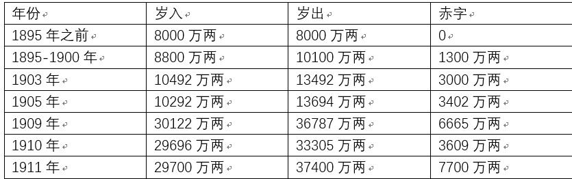 伴随着清末新政的开始,清政府的岁入岁出和赤字都在急剧增加,我们做一个表格以更好地展现这一变化过程: