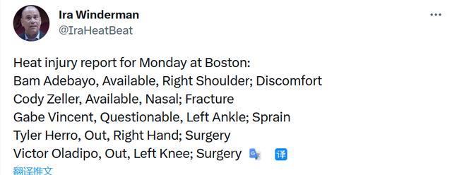 热火队这边,阿德巴约和泽勒可以出战明天的比赛,文森特出战成疑,奥拉迪波和希罗确定无缘。在东决G4中,文森特在一个进攻回合中扭伤了自己的脚踝,随后他坚持打完G4,但没有参加G5,直到昨天的G6中迎来复出,他一共出场41分钟,18投6中拿到15分4篮板。