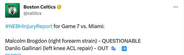 在今天早些时候,两队公布了抢七大战的伤病报告。凯尔特人队这边,布罗格登出战成疑,加里纳利确定无缘。根据之前的报道,布罗格登遭遇右肘韧带撕裂,他在东决G1和乐福的相撞导致伤势加剧,随后他一直带伤出战。但是在东决G5出战7分钟后,布罗格登选择退出比赛,并缺席了G6!