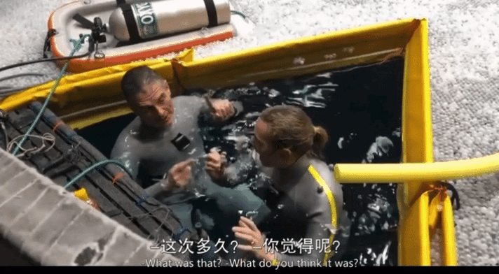 她反复下潜、失败、喘气上浮,在刷新了水下憋气7分15秒的记录后,她激动尖叫。