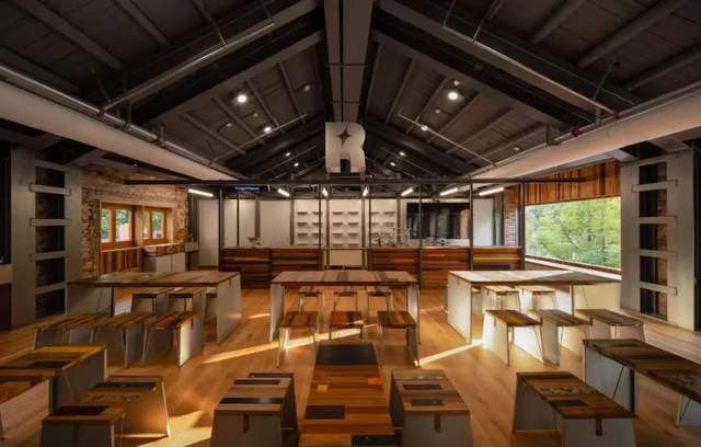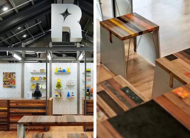 店里的桌椅用具,与三顿半去年11月在上海愚园路开业的首个品牌线下体验空间同款,回收椰子木制成桌椅,咖啡小罐和城市垃圾再生材料拼贴成彩色纹路,环保理念外化,很有视觉冲击力,又时髦随性,体现三顿半的「循环」主张。