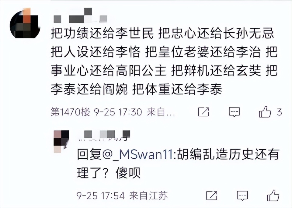 网友的一条热评是这样说的:《盛世天下》制作组亲启,请把功绩还给李世民,把忠心还给长孙无忌,把人设还给李恪,把老婆还给李治,把皇位还给武则天,把李泰还给阎婉,把体重还给李泰。《盛世天下》女帝篇大刀阔斧的魔改一事,不但引起了网友众怒,也促进了影视文艺创作者对于历史改编边界的反思。影视化改编首先要考虑的就是历史真实性,一些涉及到重要人物和具体事件的点不要乱加个人向观点,如武则天称帝,长孙无忌的忠臣身份等。