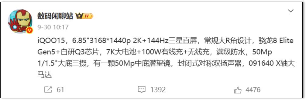 博主数码闲聊站曝光了iQOO 15的详细规格:“iQOO15,6.85"3168*1440p 2K+144Hz三星直屏,常规大R角设计,骁龙8 Elite Gen5+自研Q3芯片,7K大电池+100W有线充+无线充,满级防水,50Mp 1/1.5"大底三摄,有一颗50Mp中底潜望镜,封闭式对称双扬声器,091640 X轴大马达”
