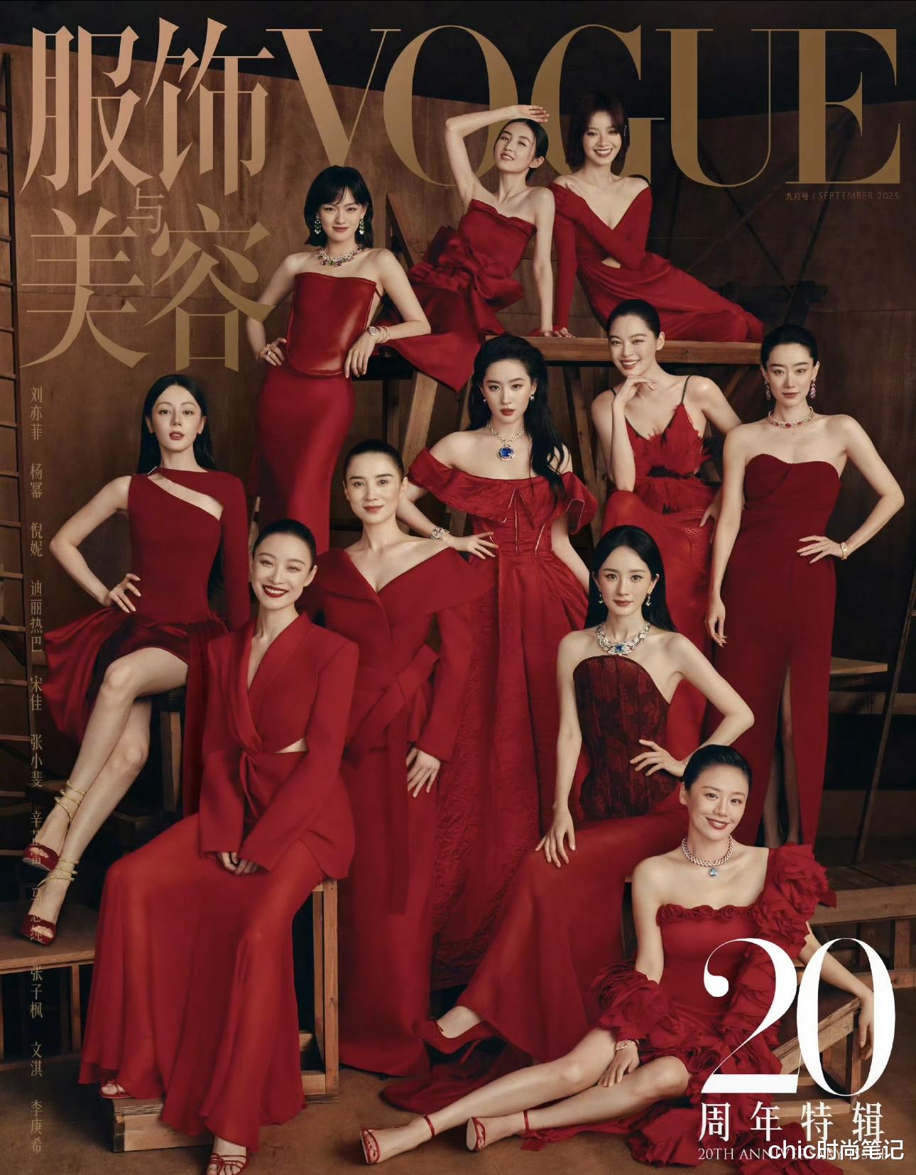 VOGUE杂志20周年请来了11位当红女明星同框拍摄金九封面,于9月5日正式发布封面照。11位女星身穿正红色礼服倾情演绎时尚大片,流量与实力兼具的她们,有一种百花齐放的盛世之美。