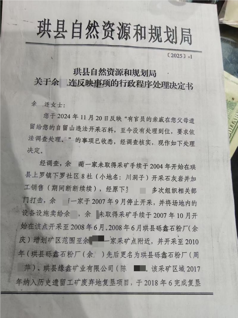 余某连透露,余某庆系当地县级相关部门相关负责人的亲属。针对涉事林地的相关问题,相关部门既未为余氏兄妹办理林权证,也未就石料被开采的损失作出赔偿,反而多次联系二人,提出以发放贫困补助的方式处理此事。而余氏兄妹提出的合法诉求 —— 依法核查相关行政行为合法性、返还林地并完成确权颁证手续,多年来一直未获妥善解决。