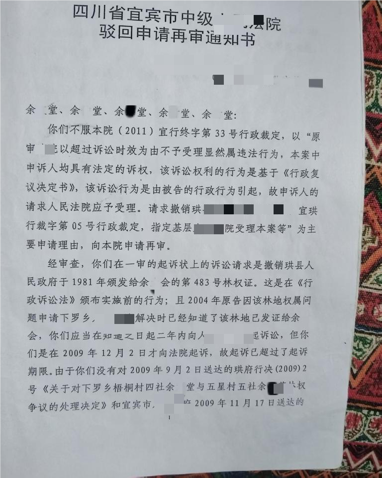 2009 年,珙县行政部门作出确权决定,将该林地使用权错判给相邻方,余氏兄妹对此持有异议,依法向市行政部门申请复议却未达到满意答复。随后,向珙县法院提起行政诉讼,获(2009)宜珙行裁字第 05 号不予受理的行政裁定。此后多年,市中院、省高院先后作出驳回再审申请、驳回申诉的相关文书,维护权益未获实质进展。