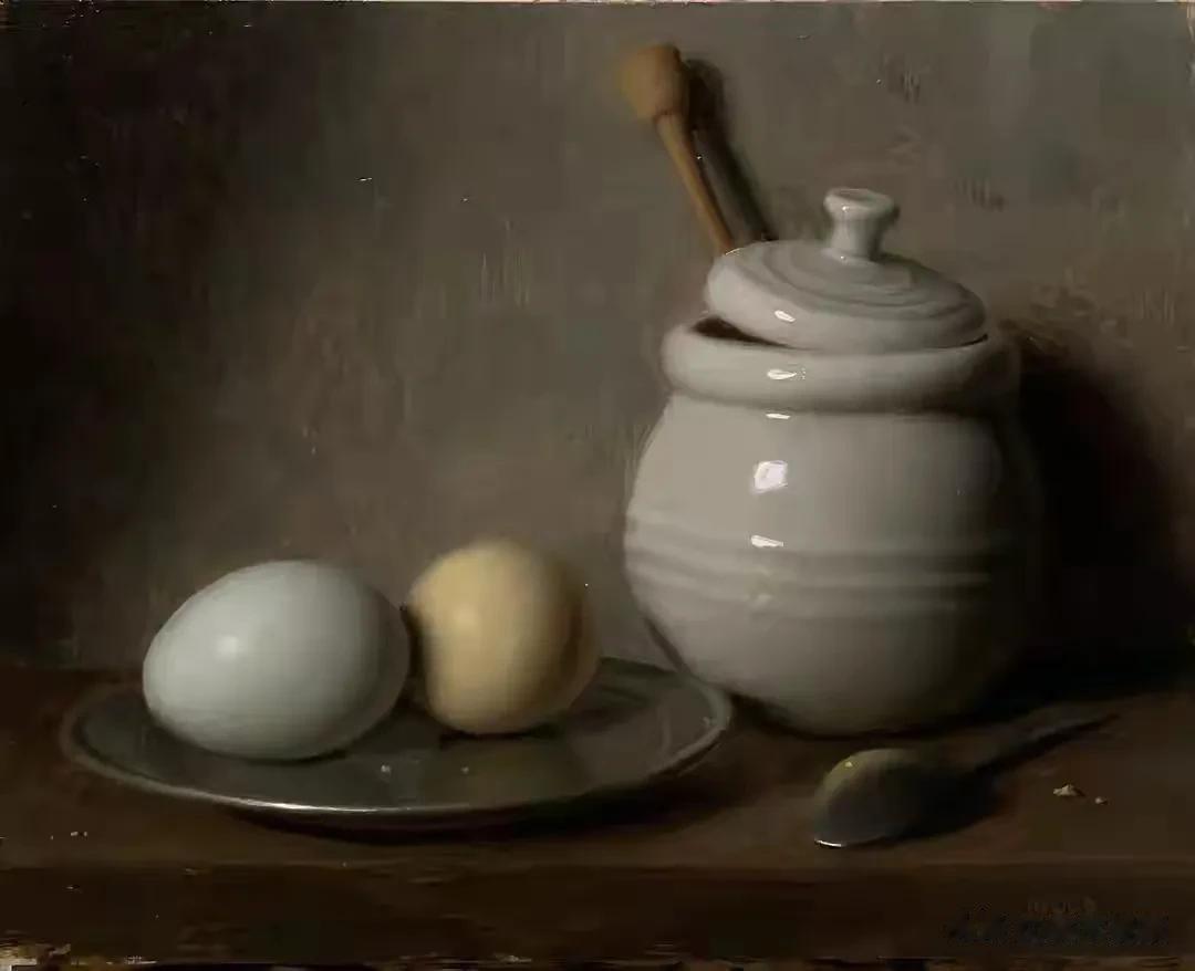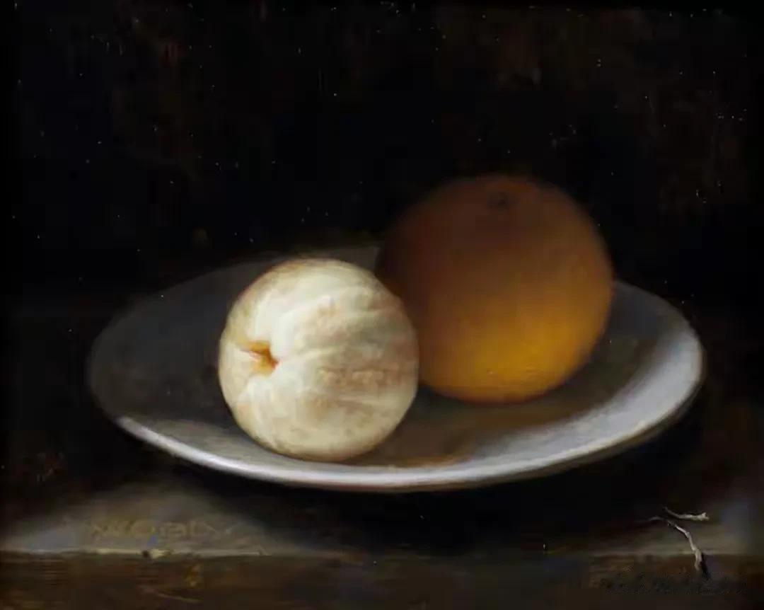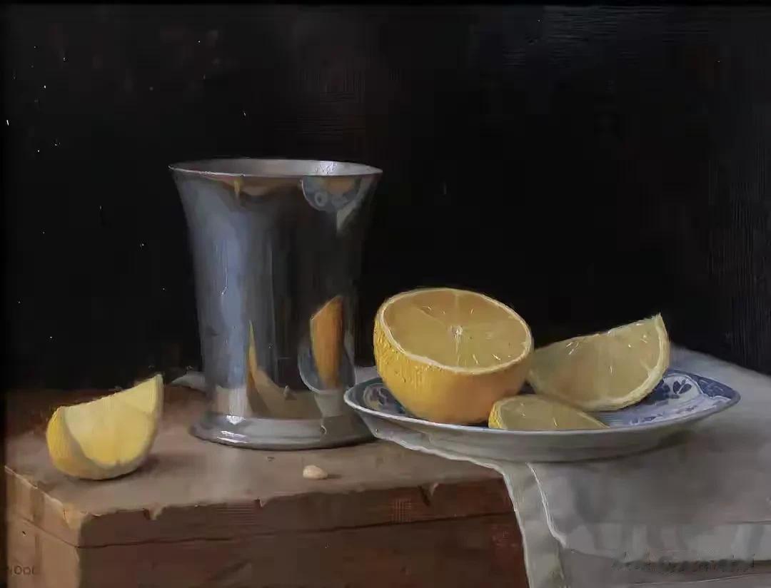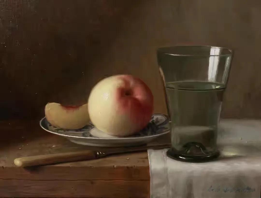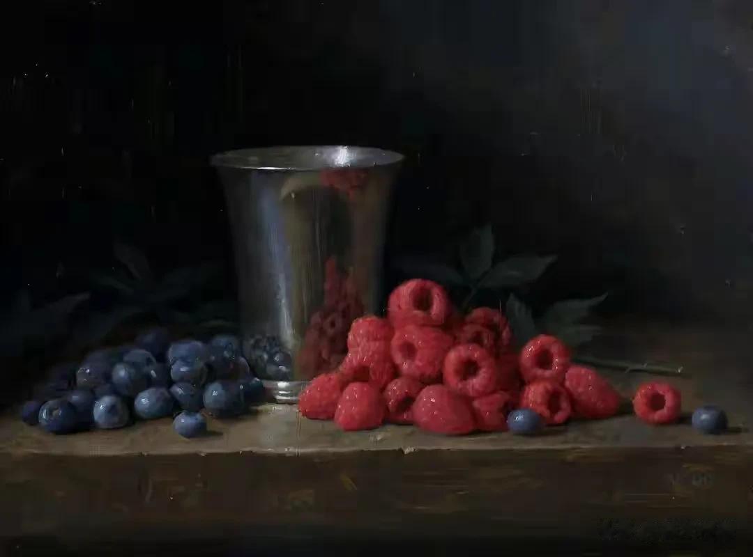 他的作品里,卡拉瓦乔的戏剧张力与伦勃朗的光影深邃交织共生,明暗交错间,水果凝着晨露的剔透,器皿泛着岁月的温润,每一件静物都在光的轻抚下苏醒。