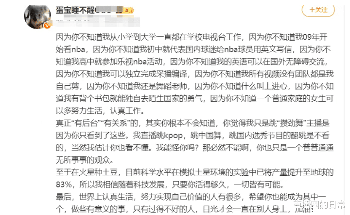 这事儿,你说奇怪不奇怪?一个曾经的女主播,怎么就摇身一变成了NBA的采访嘉宾呢?最近的留言评论中,就有人问到了这事儿。对此,蛋宝也是发了一篇长文回应,说自己从小学到大学都在学电视台工作,而且09年就开始看NBA,初中就代表国内球迷给NBA球员用英文写信,高中就参加乐视NBA活动,英语可以在国外无障碍交流,能独立完成采播编译,所有视频都是自己剪的……