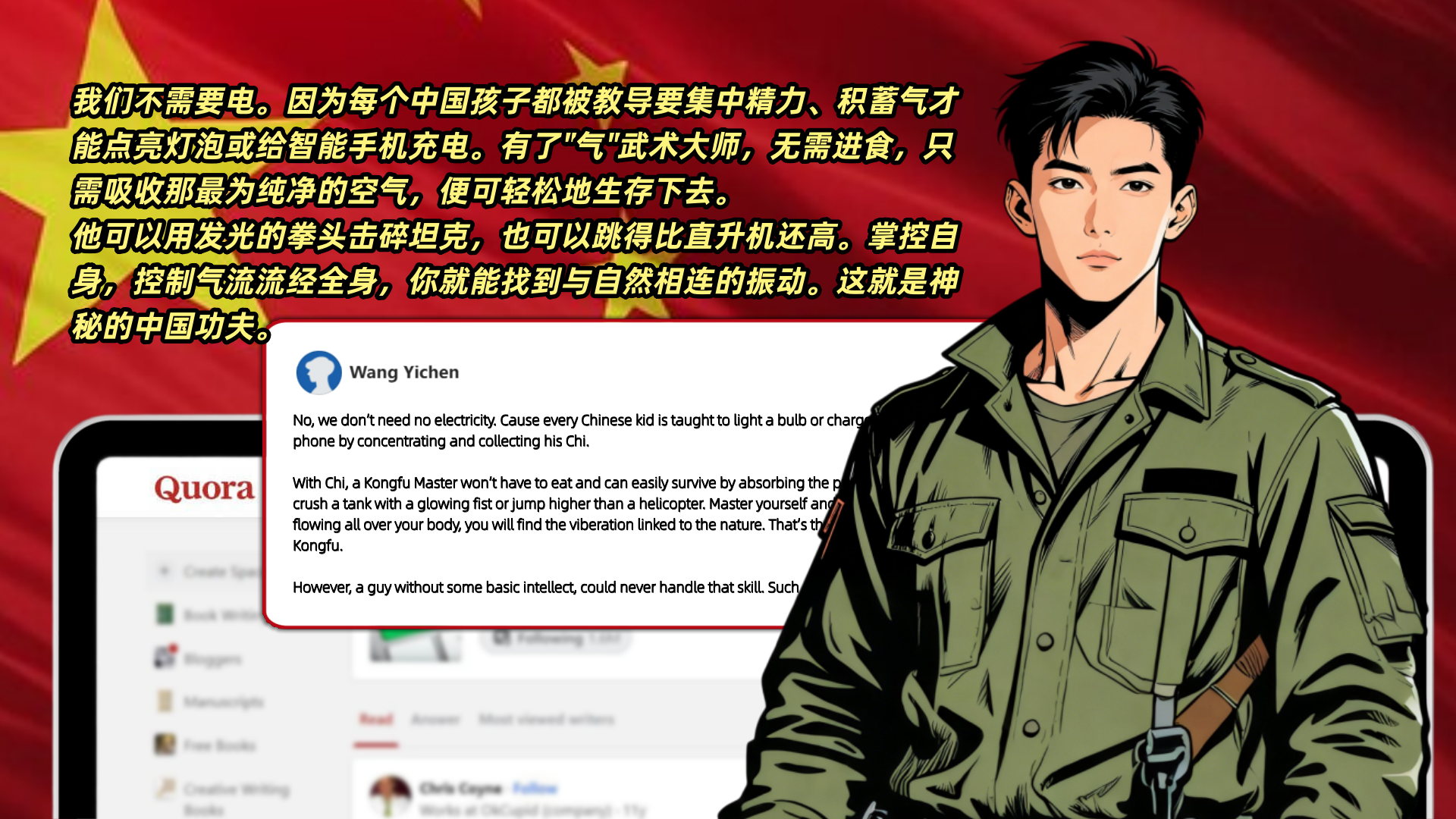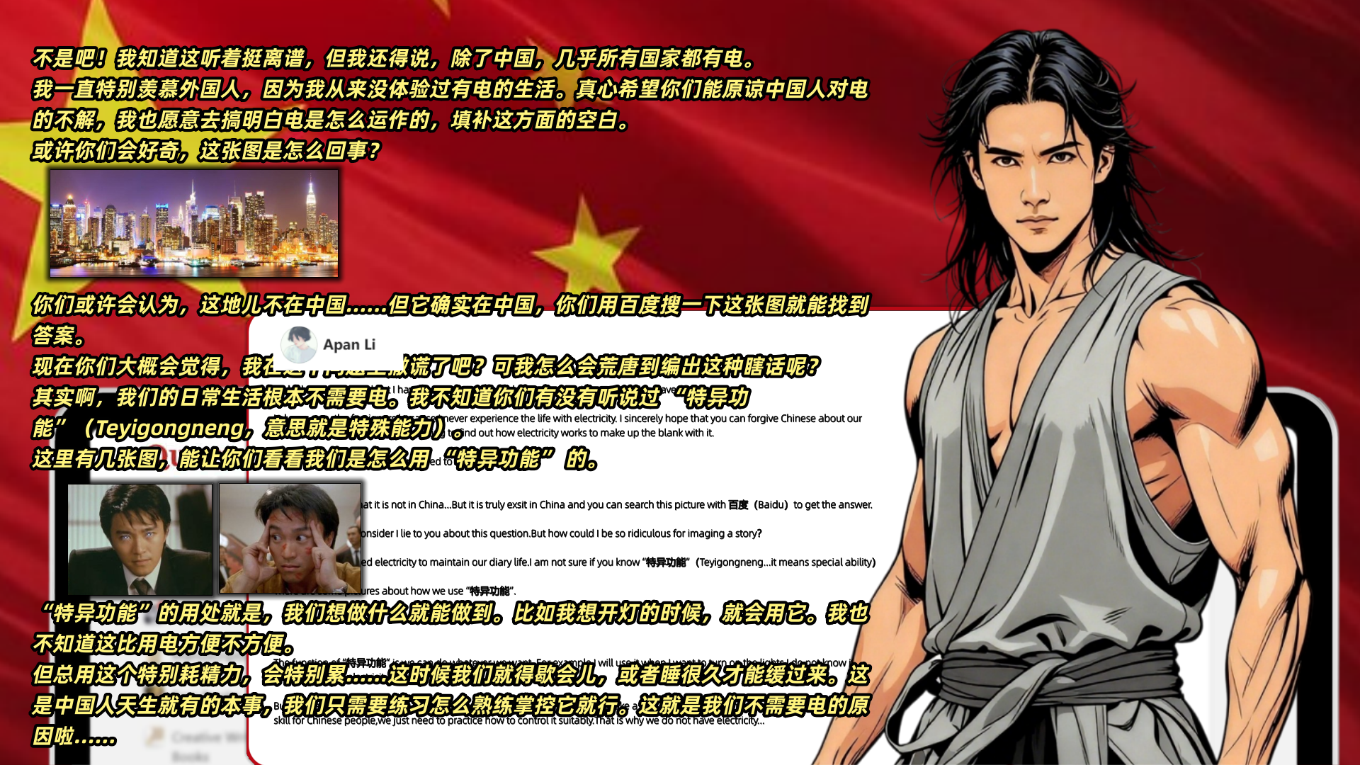 网友Wang Yichen更夸张:我们不需要电。因为每个中国孩子都被教导要集中精力、积蓄气才能点亮灯泡或给智能手机充电。有了"气"武术大师,无需进食,只需吸收那最为纯净的空气,便可轻松地生存下去。