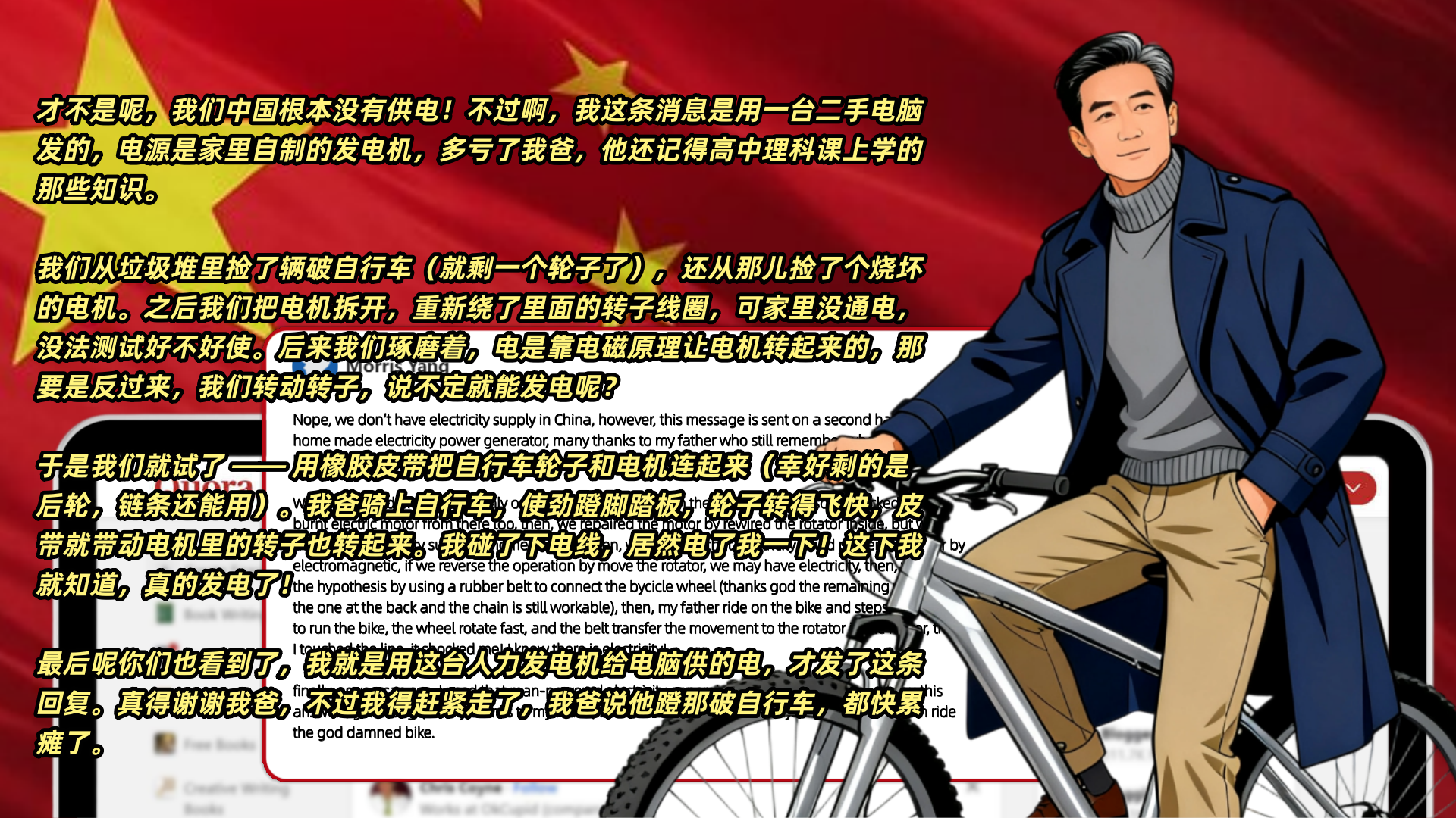 还有网友Morris Yang也是有理有据:才不是呢,我们中国根本没有供电!不过啊,我这条消息是用一台二手电脑发的,电源是家里自制的发电机,多亏了我爸,他还记得高中理科课上学的那些知识。