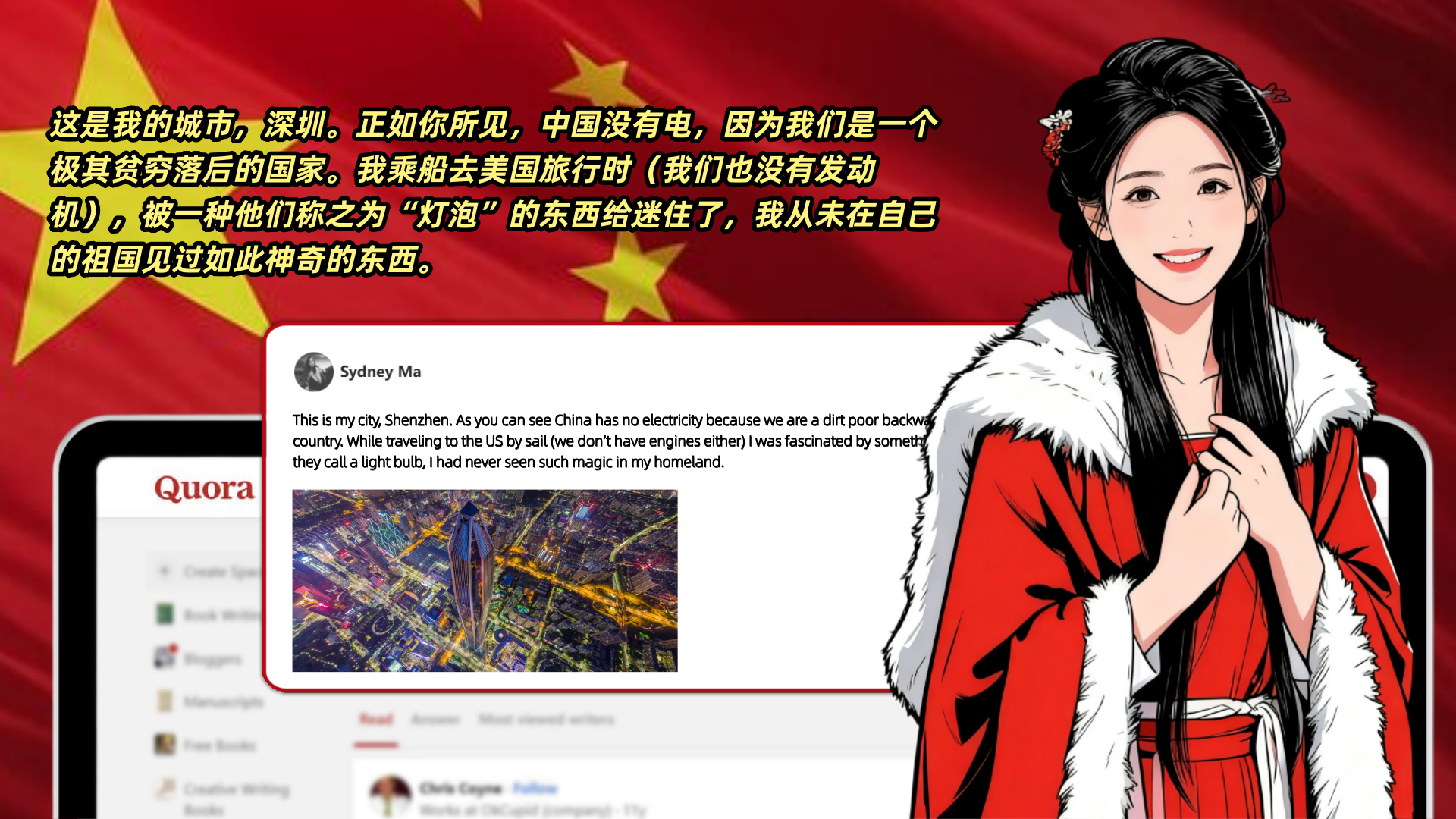 网友SydneyMa调侃道:这是我的城市,深圳。正如你所见,中国没有电,因为我们是一个极其贫穷落后的国家。我乘船去美国旅行时(我们也没有发动机),被一种他们称之为“灯泡”的东西给迷住了,我从未在自己的祖国见过如此神奇的东西。
