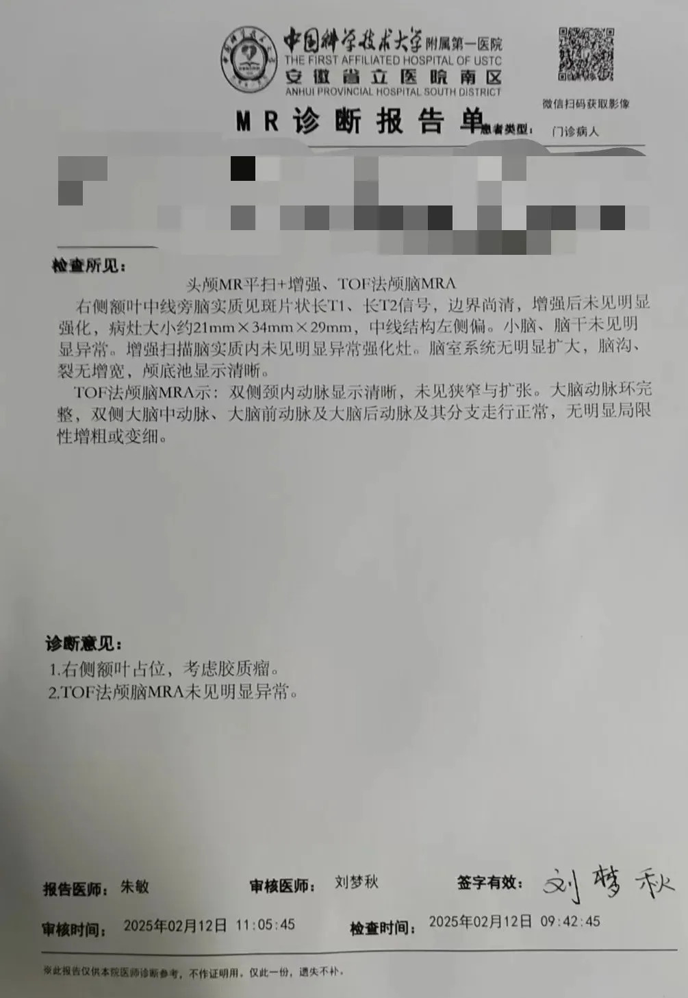 这绝非寻常发现。分院立即启动“重要异常结果处理流程”,第一时间上报。健管部的电话紧随其后,以关切而专业的语气通知了王女士及其家人。高度警惕之下,家人迅速带她前往安徽省立医院南区进行深度检查(核磁共振、增强造影),结果指向“右侧额叶占位,考虑胶质瘤”。