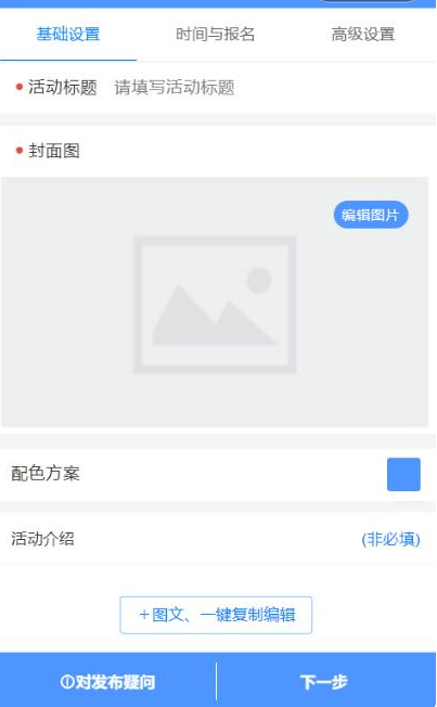 3.关于投票主题、投票介绍、图片添加的一个设置界面,根据提示一步步的填写一下就可以发布活动了。对于参赛者自主报名,活动发起方可以在后台开启自动报名设置,参赛选手可以在线实时报名。参赛者自主报名后,活动发起方即可在后台审核选手选项中,对选手报名资料进行审核。作为活动发起方,还也可以通过公众号收集整理参赛选手报名信息,在后台投票选项中添加选项,并进行封面上传,设置描述详情等操作。
