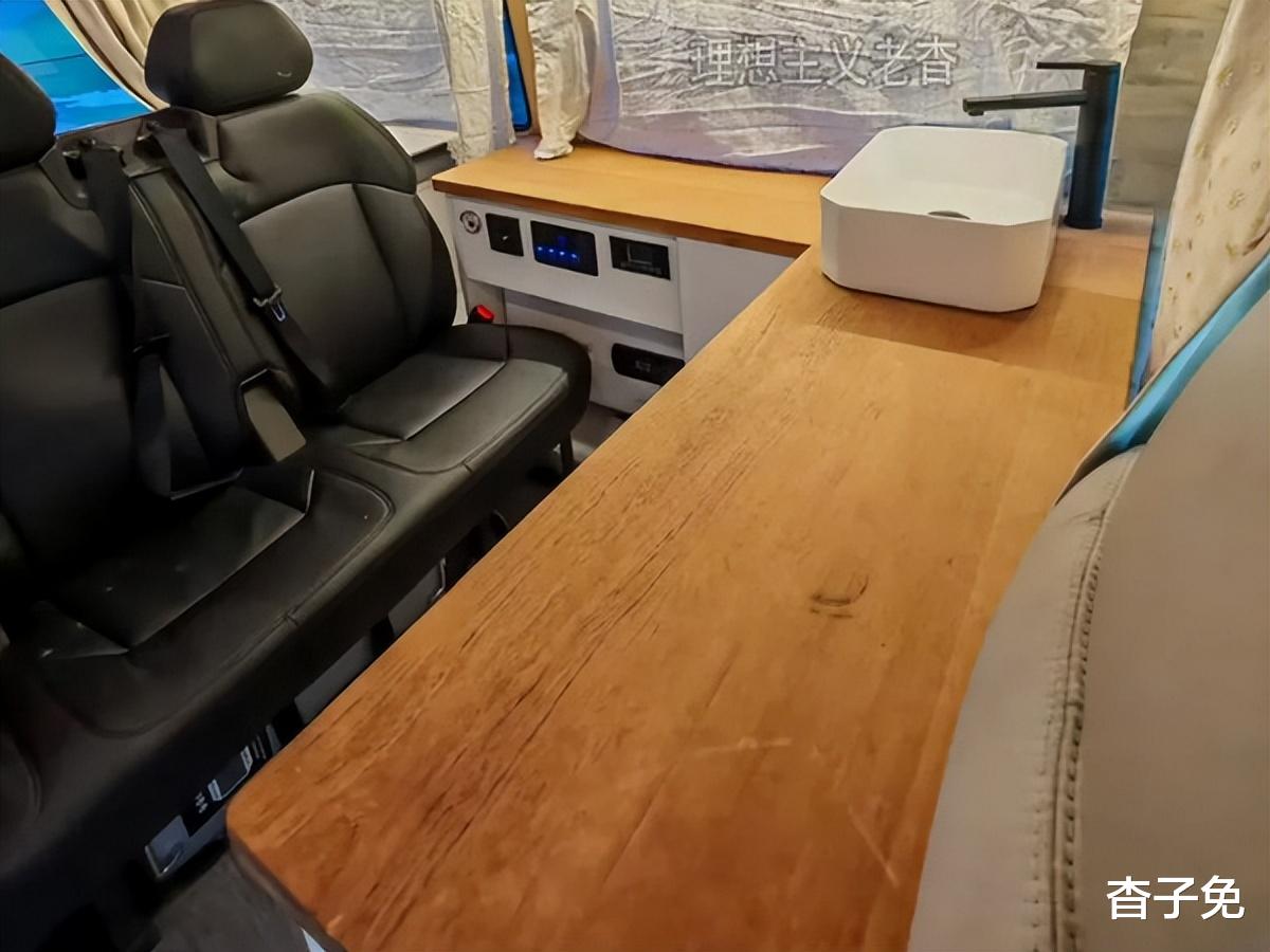 打开中门,前后排座椅之间添置了一张拐角桌柜,横桌就是日常喝茶办公的地方,拐角处是洗菜池,里侧是微厨区域,下面有水有电有炊具,带上食材就可车内做饭。