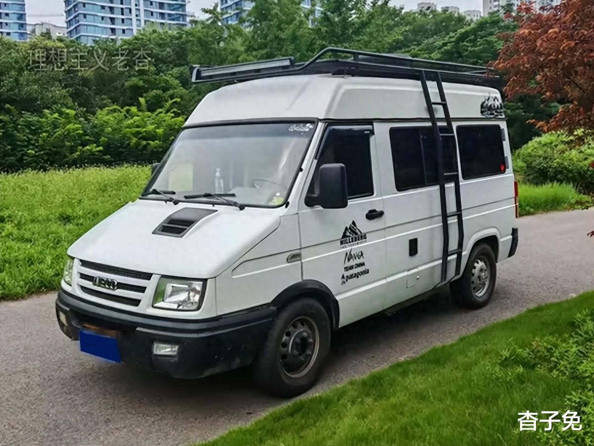 这是一台依维柯得意,柴油2.5T排量,手动5挡,4门5座,短轴中顶,通身大白色原车漆,车顶加装了行李架,左侧配备了爬梯,右上还有侧边帐方便户外露营。