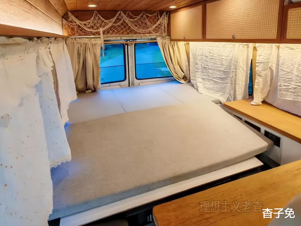 折叠后排座椅,就可与尾箱拼成一张竖向双人床,床铺非常平整,四面都有窗帘,上部两侧还有吊柜,可以放一些轻便的床上用品,打造车载移动温馨小卧室。