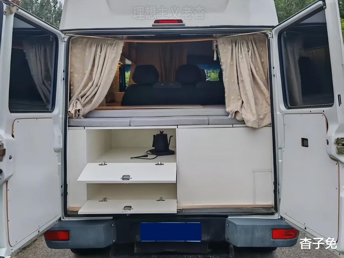 打开对开式尾门,床铺下面都是储物空间,可放一些洗浴用品,在两门之间搭上雨帘就是户外淋浴间,旅途冲凉一身轻松。