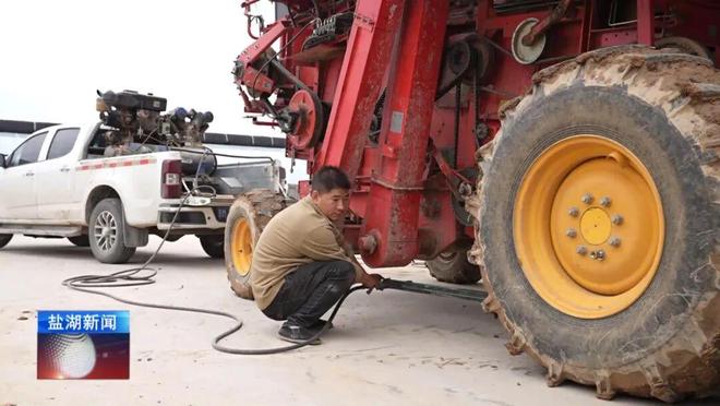 与此同时,在盐湖区中农福农机专业合作社联合社,一场针对农机“穿新鞋”的技术改造也在紧张有序地推进。持续阴雨让田间变得泥泞不堪,收割机“下地就陷、进退两难”,严重阻碍秋收进度。农机技术人员争分夺秒,在收割机原有轮胎外侧精准加装特制轮胎,使轮胎接地宽度从原来的40公分增加到70公分。这一“双胎加固”的改造妙招,大幅增大了轮胎与泥地的接触面积,有效分散了设备对地面的压强。改装后的收割机重新驶入泥泞农田,行驶平稳顺畅,作业效率显著提升,为抢收快收提供了坚实保障。