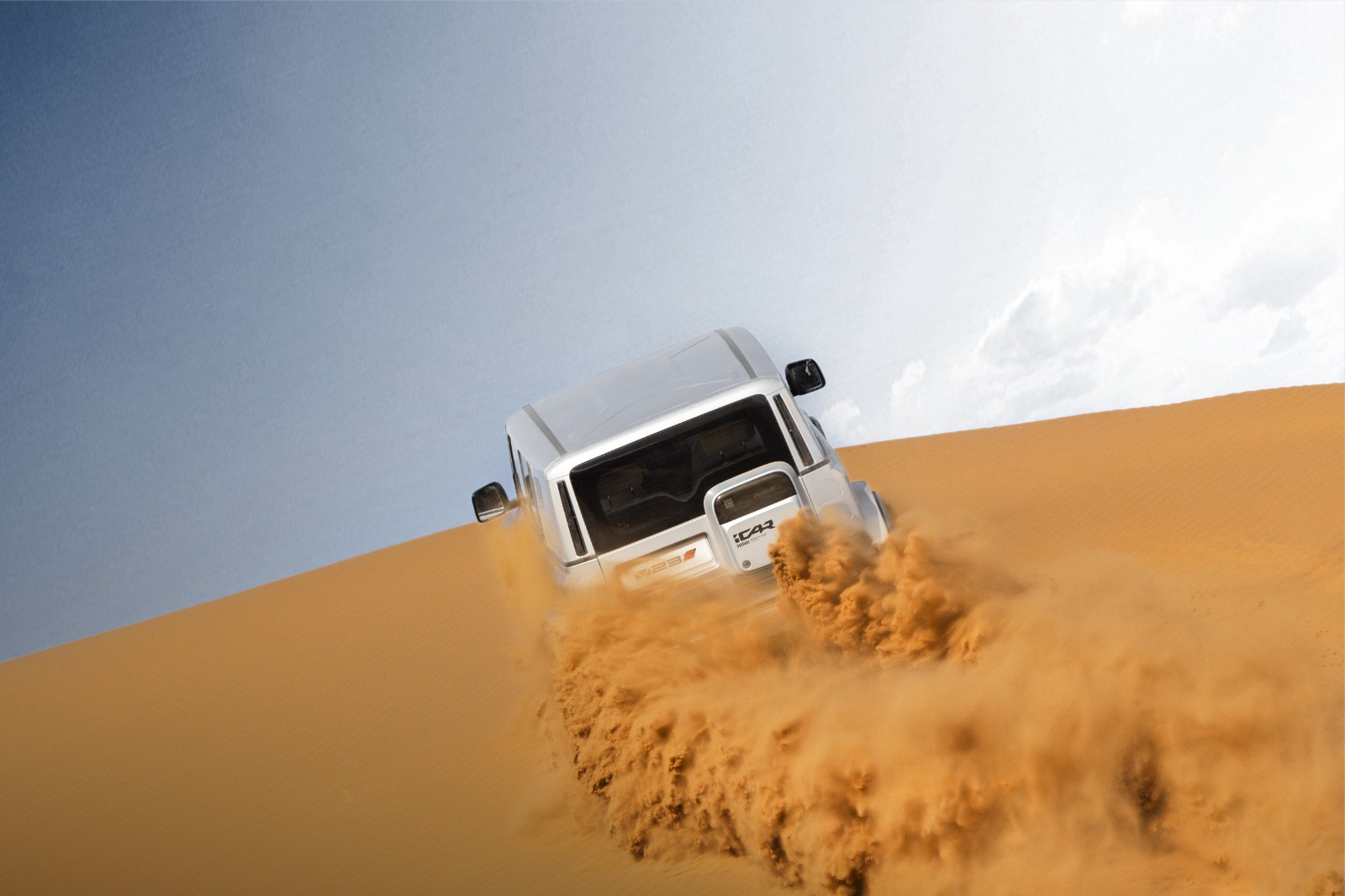 造型设计上,整车采用经典方盒子架构,以4220mm修长车身勾勒1915mm超宽体态,黄金比例辅以21英寸花瓣轮毂尽显复古张力。蚌壳式引擎盖下暗藏四角毫米波雷达,圆形LED大灯组与悬浮外挂备胎形成传统与现代的视觉对话。四驱版本43°接近角与210mm空载离地间隙,赋予其征服复杂地形的硬核资本。