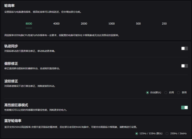 另外还有轨道同步、偏移修正、波纹修正等模式,有一键狂暴模式能够将同步拉满传感器与无线带宽,毫秒级延迟,追踪瞬时无拖影。