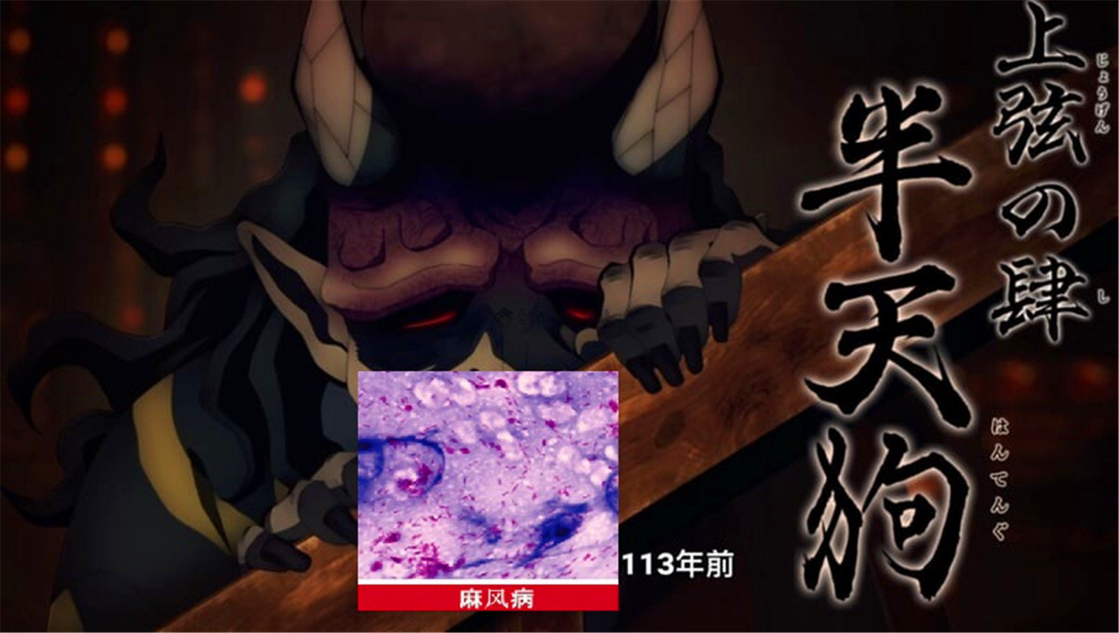 上弦之肆半天狗额头肿大,头上有两只角,是面容有如般若的老鬼,登场时眼睛肿大、走路不稳健,十分符合眼睑闭合不全、表面有结节、四肢麻木等麻风病的典型特征。而麻风病写成日文时,对应了英文的“lie”,有骗子的意思,而人类时期半天狗就是做坏事的小偷,这是巧合吗?