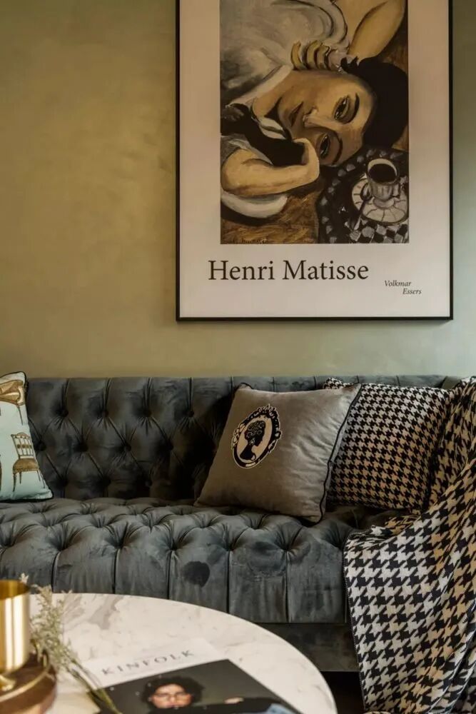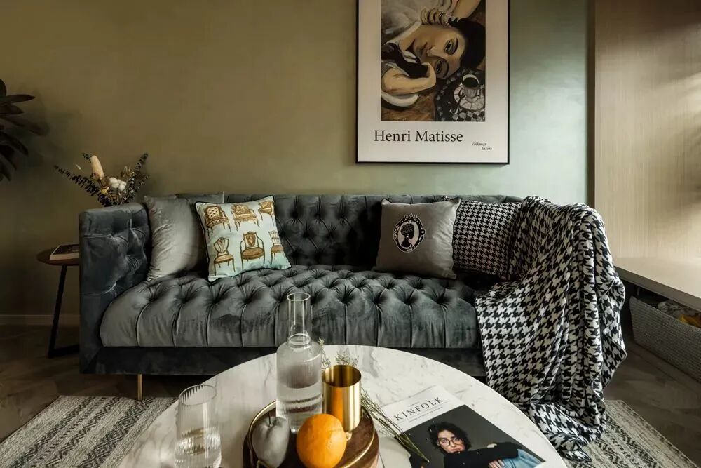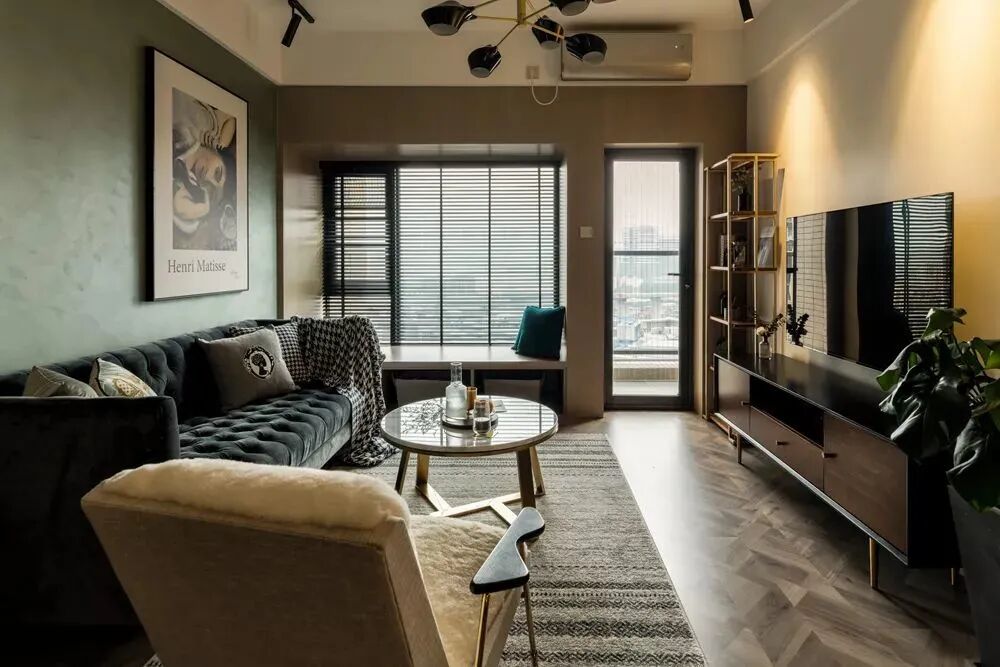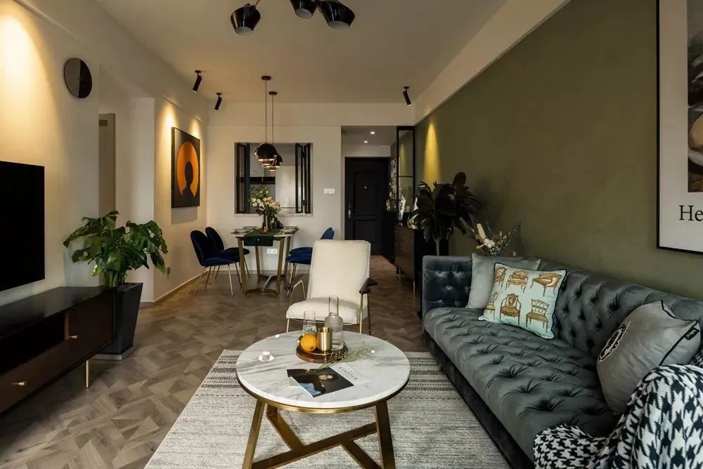 ▲沙发墙连贯餐厅、玄关区域,整体都是绿色复古格调,还有深色的斗柜鞋柜、黑色框玻璃屏风,再摆上绿植装饰,呈现出一种简约自然的舒适氛围感。