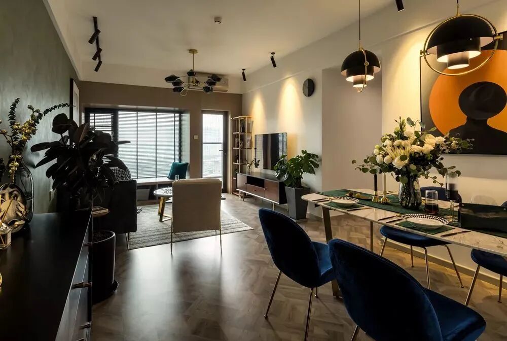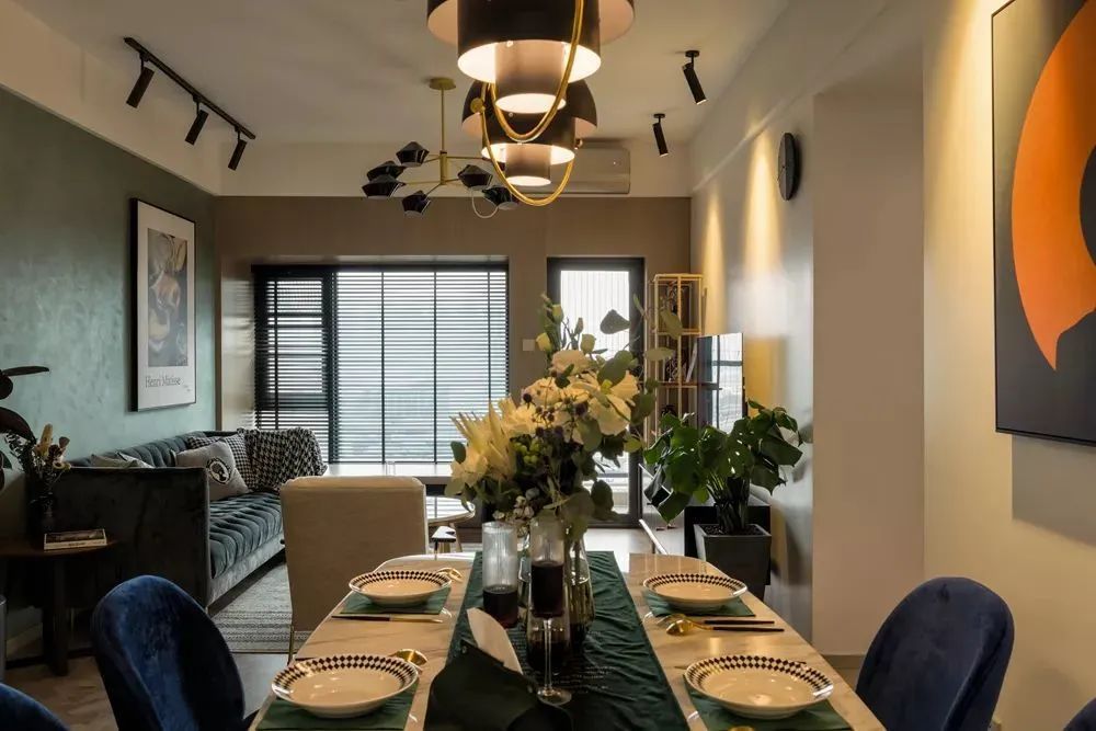 ▲餐厅连着客厅,金属脚的餐桌椅,雅白大理石台面的餐桌,还有墨蓝色的布艺靠背坐垫餐椅,在轻奢小资的吊灯,橙黑色调的装饰画,让餐厅显得雅致端庄而华丽。