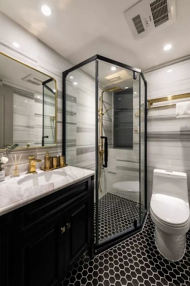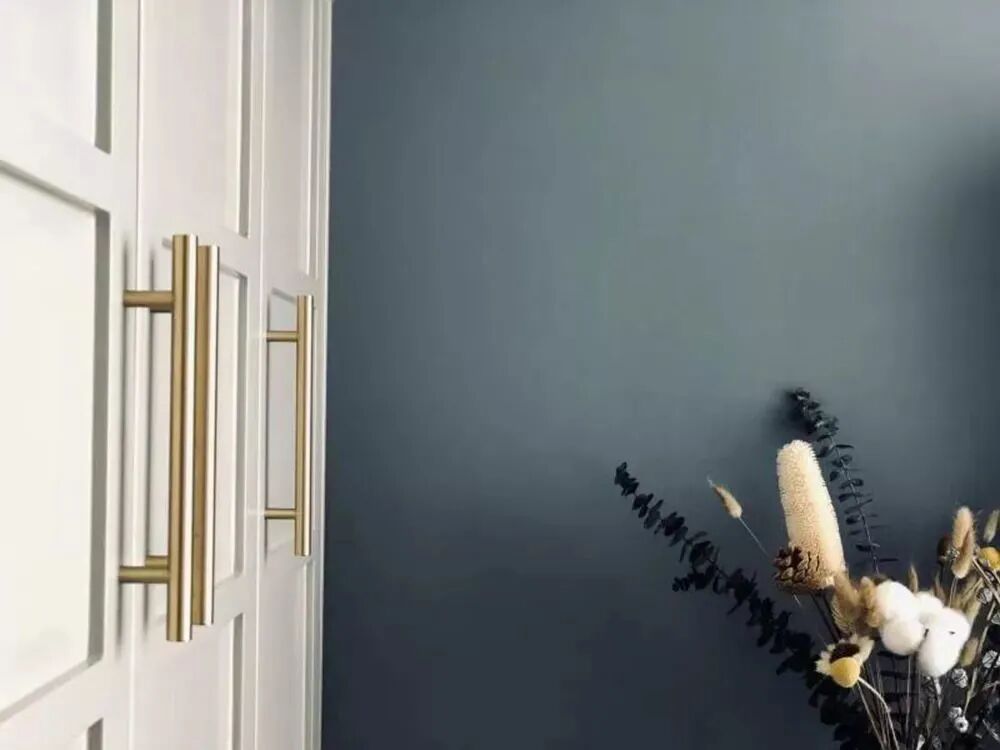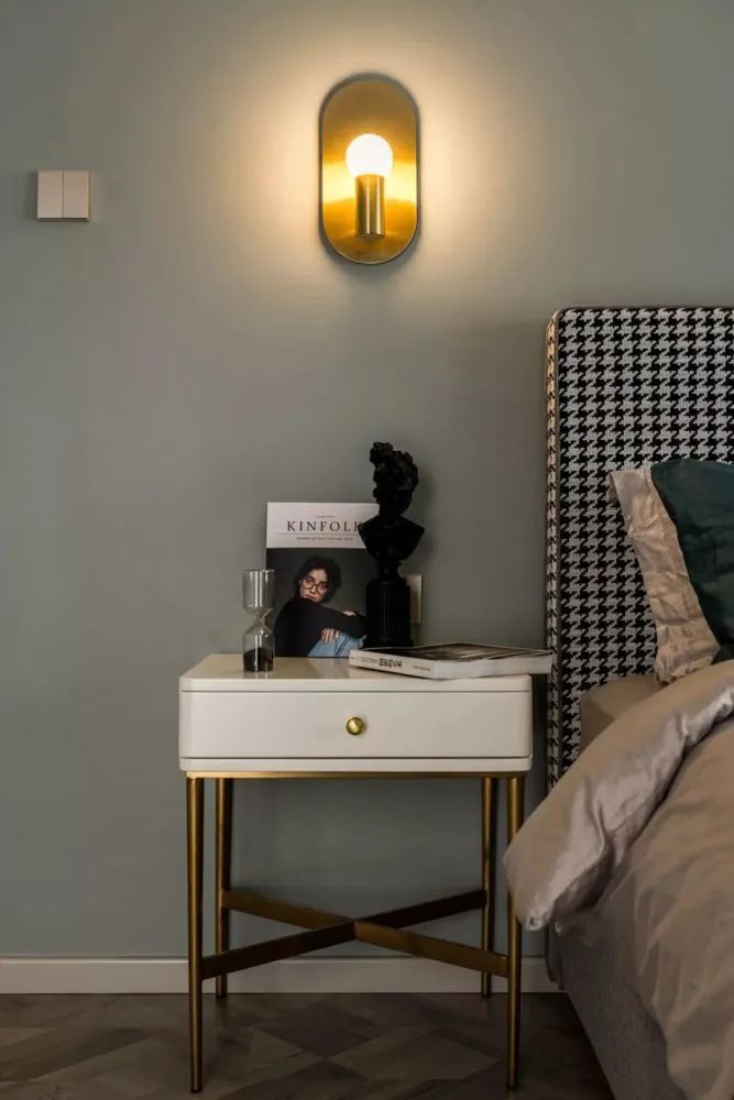 ▲床头墙的黑色床头柜,摆上干花花瓶布置,还有侧边简雅柜门装着铜色拉手,让空间充满华丽精致的气质感。
