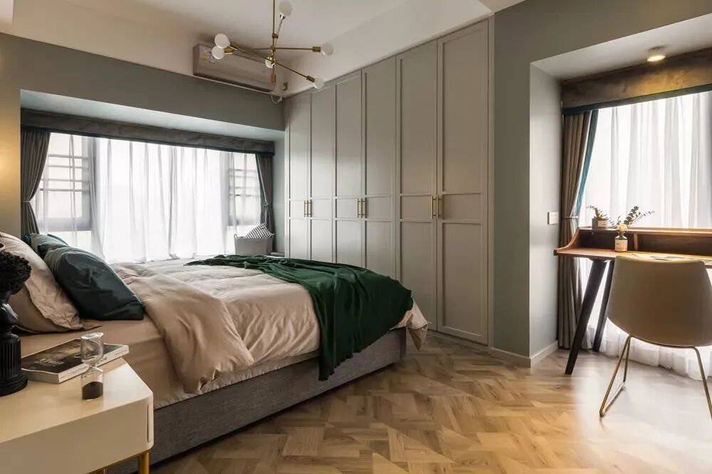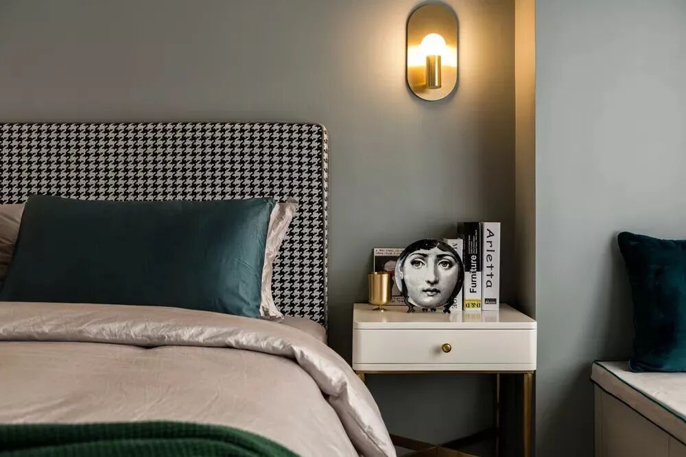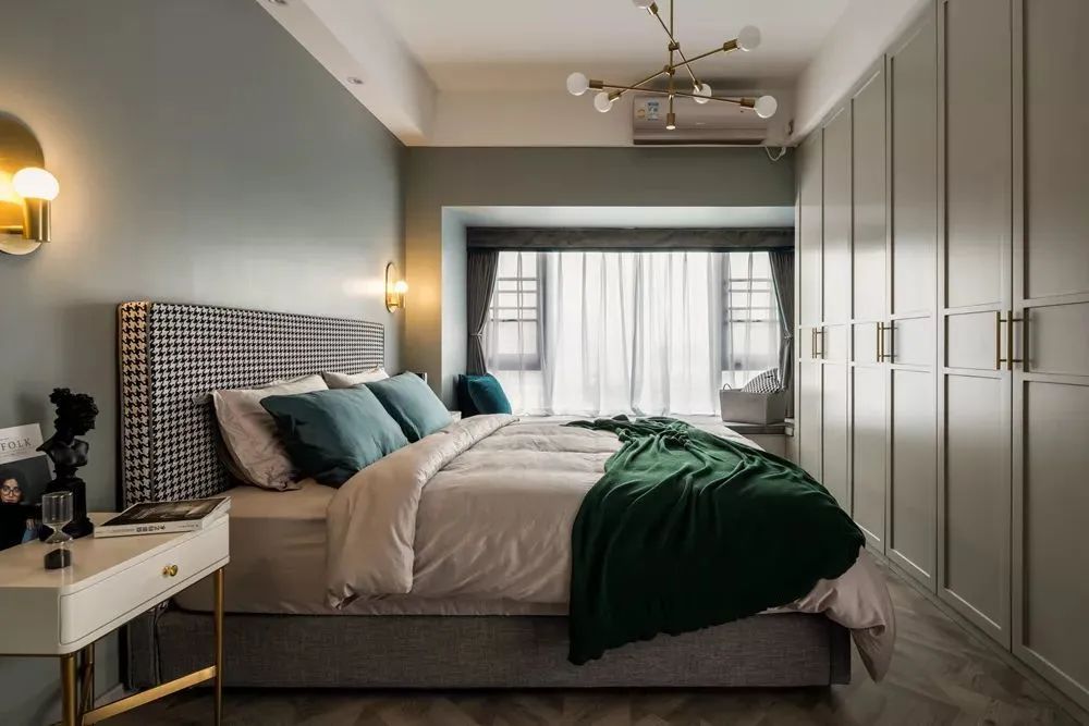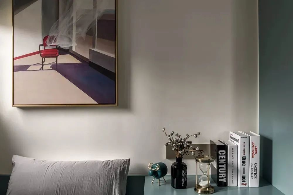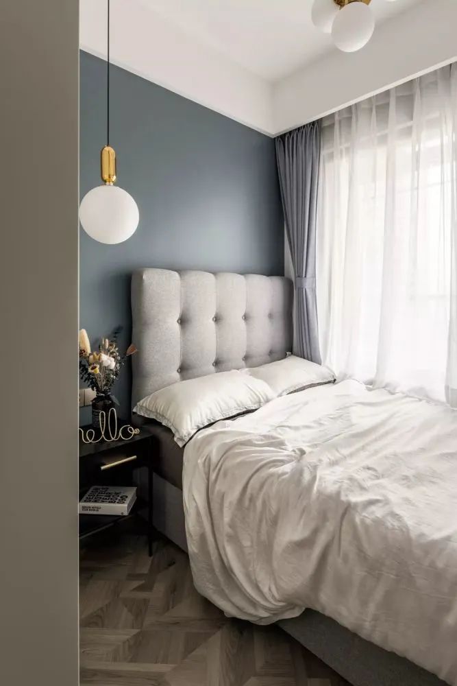 ▲主卧空间相对紧凑,灰蓝色的墙面基础,搭配布艺床铺,墨绿色床单枕头布置,让空间显得更加端庄舒适;而入墙式衣柜的设计,也是保持空间简洁大方的同时,提供了实用丰富的储物位置。
