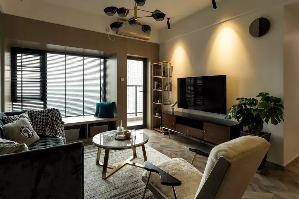 ▲灰色复古调的布艺沙发,搭配大理石质感的金属脚茶几,还有一张米白色的休闲沙发椅,整体空间充满了轻奢自然的气质感。