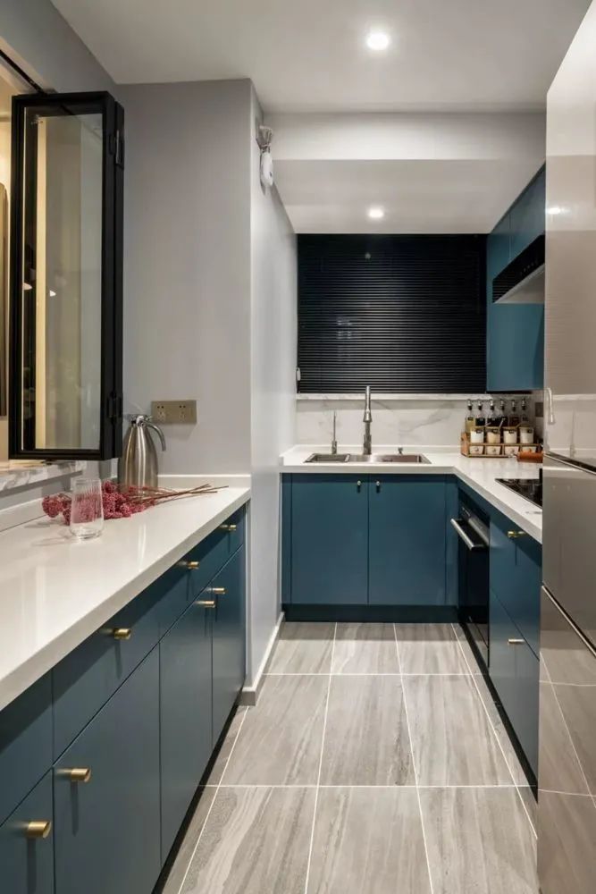 ▲厨房简洁大方的空间,搭配上蓝色的定制橱柜,U形的操作台格局,让做饭的体验更加轻松而又安静端庄。