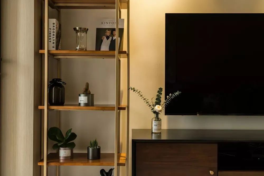 ▲简洁的电视墙,布置上胡桃木电视柜,左侧是一个金属质感的多层展示架,结合顶上两盏射灯,把电视墙营造出一种舒适温馨的典雅感。