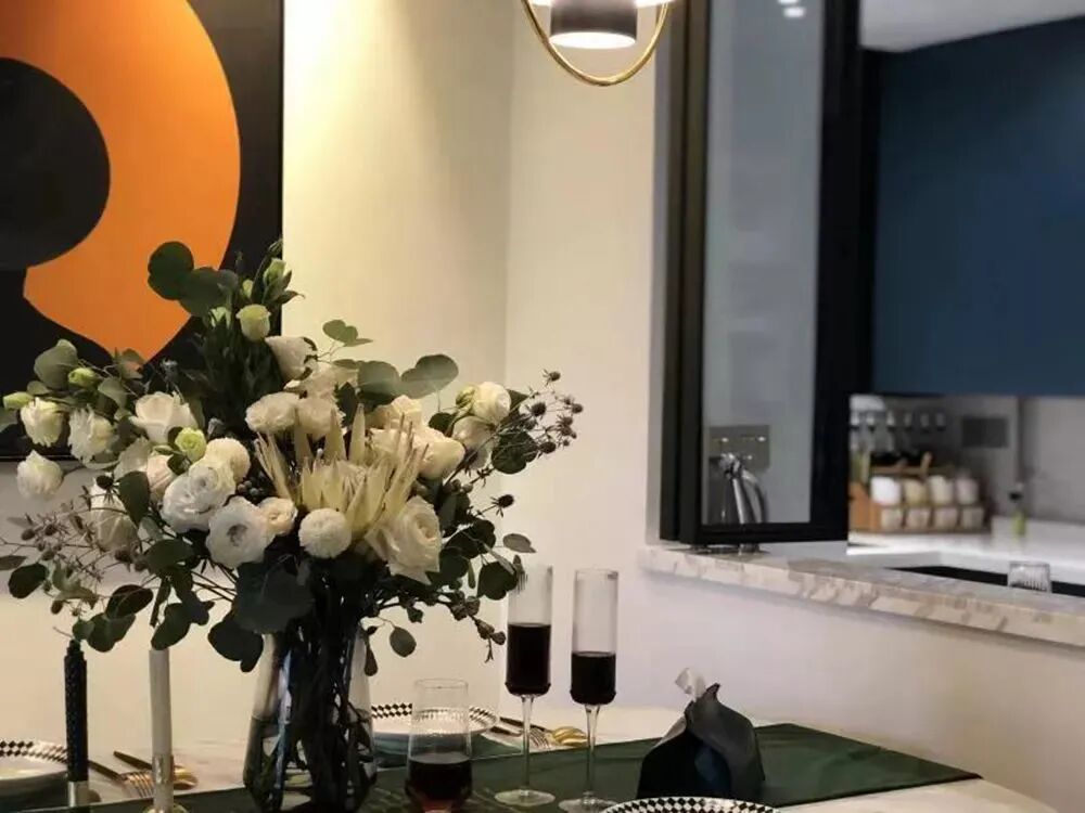 ▲餐桌上的插花、烛台,过道的矮柜上的花瓶、装饰品,整体精致的布置,使得餐厅充满了优雅舒适的仪式感。