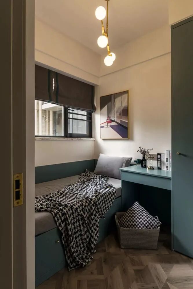 ▲次卧空间非常的紧凑,以定制书桌、衣柜+单人床的设计,整体显得静雅而又实用舒适。