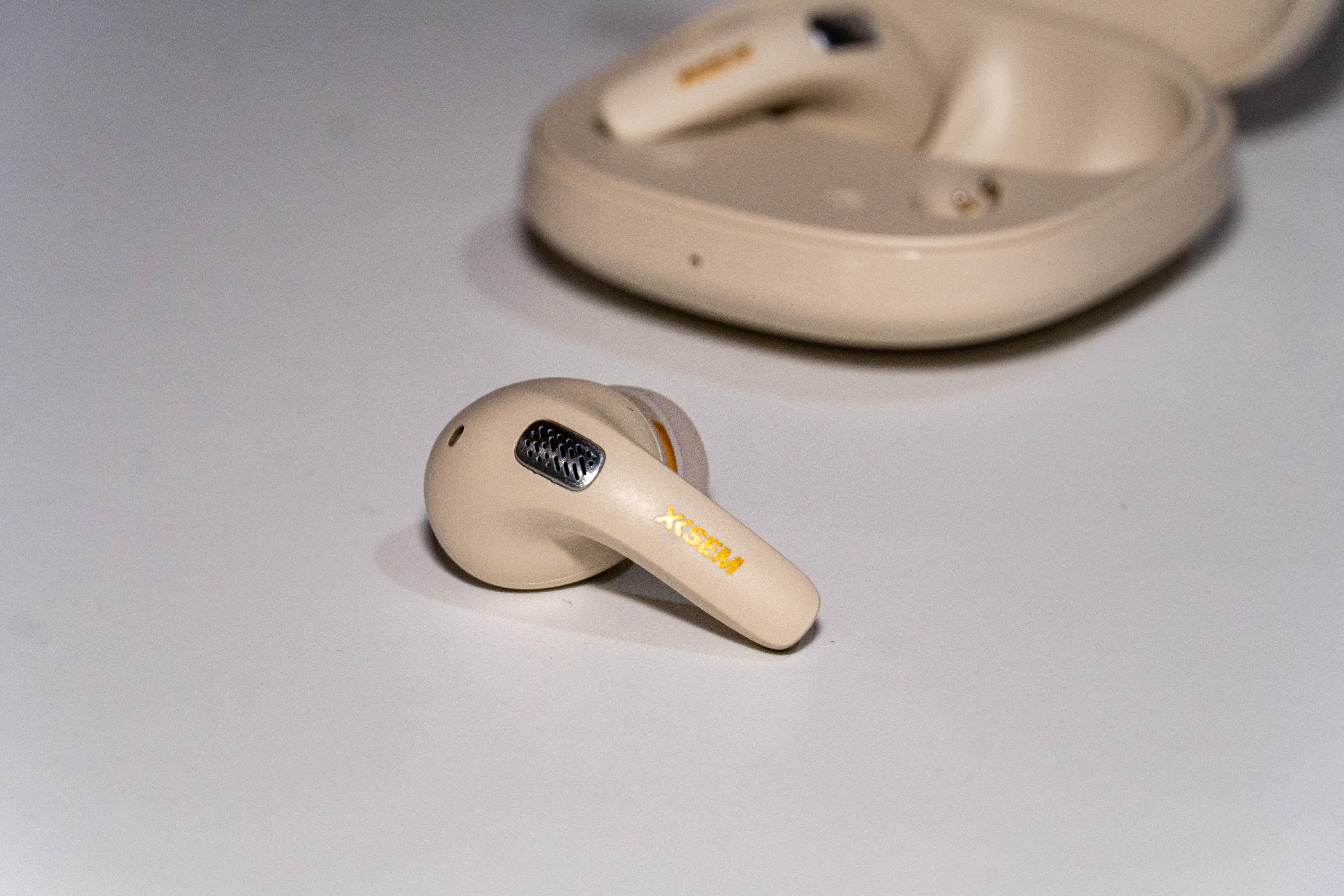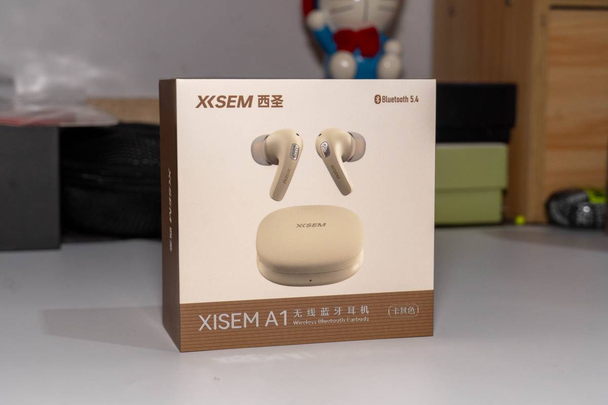 首先是外观方面,西圣 A1 耳机及充电盒为简约卡其色,充电盒小巧精致,开盖可见细腻纹理。耳机造型贴合耳道,线条流畅,搭配金色标识点缀,轻盈便携,颜值与实用性兼具,放在桌上宛如精致小物 。包装盒中除了耳机本身外还有充电线、使用说明书和两对耳帽。