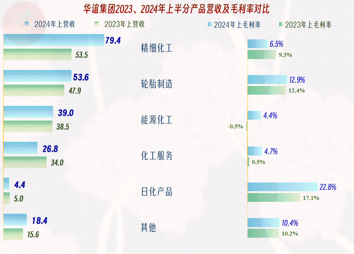 按大类看,精细化工、轮胎制造和能源化工是其占比最大的三大类业务,2024年上半年三类业务都在增长;也有化工服务和日化产品等业务有所下跌。
