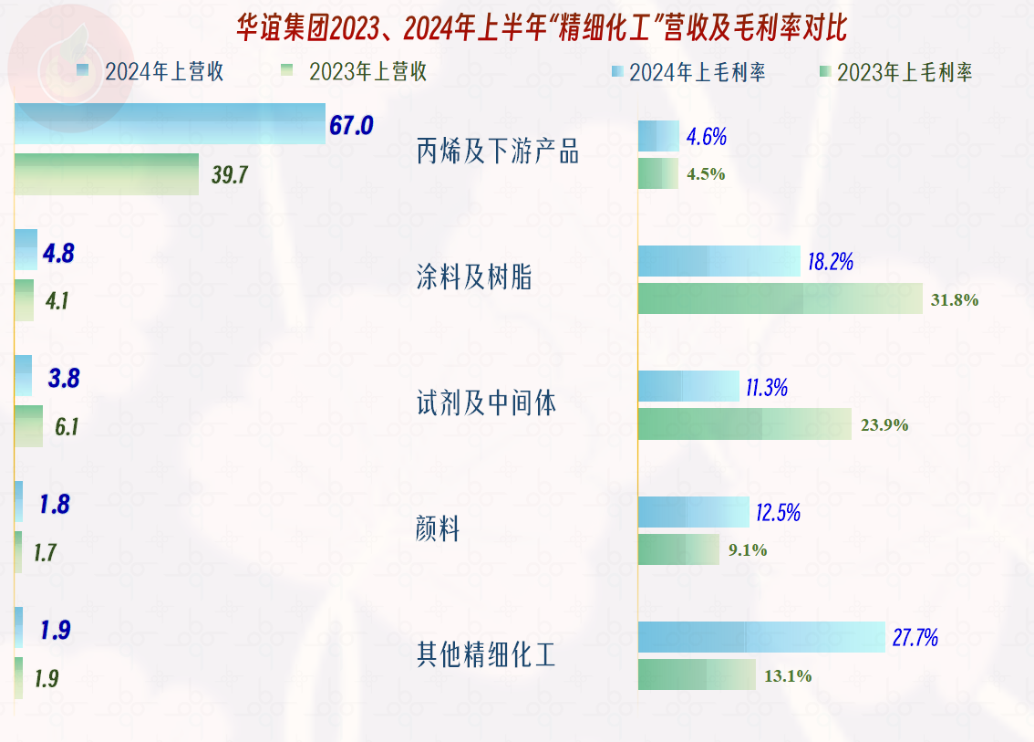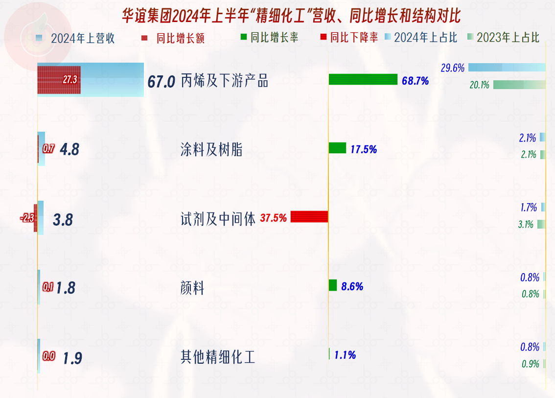 其精细化工业务中,只有“试剂及中间体”业务在下跌,其他业务都在增长,其中核心的“丙烯及下游产品”的增长是关键,对精细化工业务,甚至整个营收的增长都起到了决定性的作用。