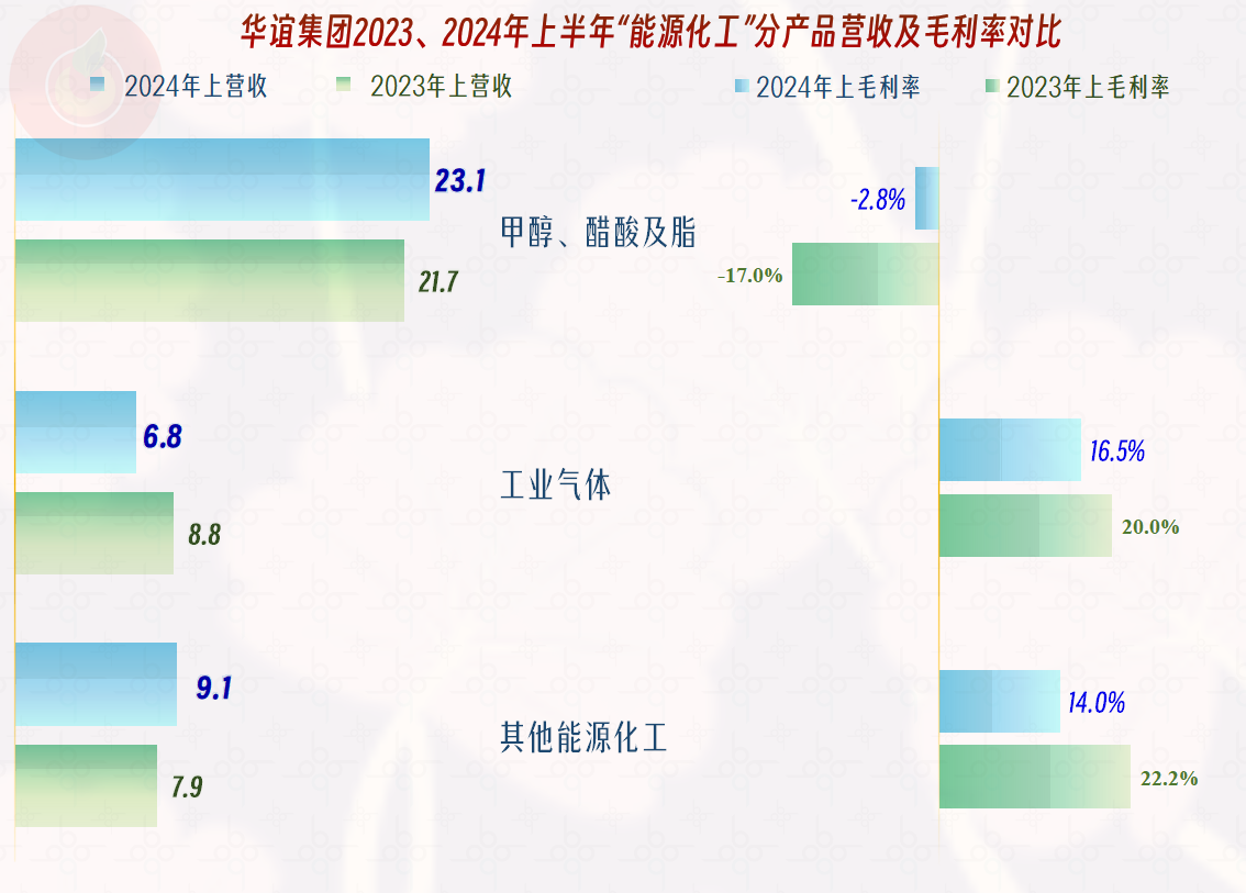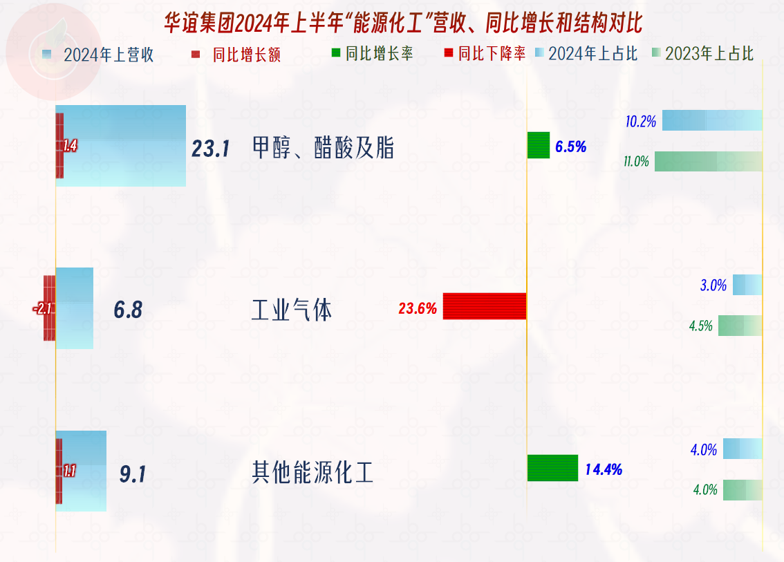 其能源化工业务中,“甲醇、醋酸及脂”和其他能源化工业务有所增长,但“工业气体”业务却有所下跌,该大类业务整体上只能算略有增长。至于其“甲醇、醋酸及脂”当中的具体产品的增减情况如何,由于太细了,华谊集团就没有再公布这些细分的情况了。