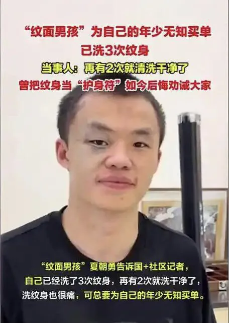 10月11日,夏朝勇给记者发来最新照片,额头、左脸、下巴已基本干净,仅剩右眼周围淡痕,预计再洗两次可在明年年中彻底清除。