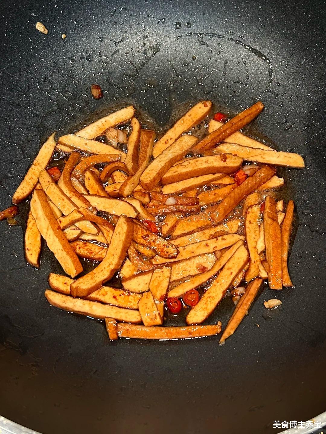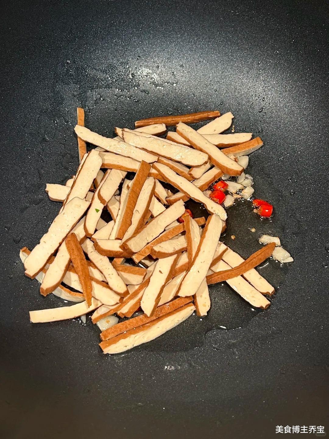 4、炒出香味后,把切好的香干片放进锅里,开中火翻炒。翻炒个一两分钟,让香干均匀受热,表面微微泛黄就行。往锅里加入一小勺生抽,继续翻炒,再炒一会儿,香干就变得色泽红亮了,这时候把香干盛出锅,放在盘子里备用。