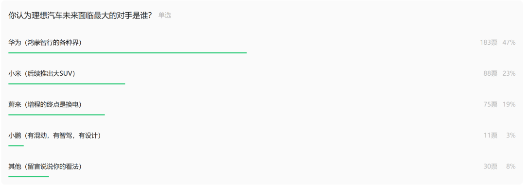 按照惯例,先聊聊上一轮对于理想汽车最大威胁到底是谁的投票的情况:
