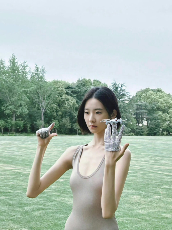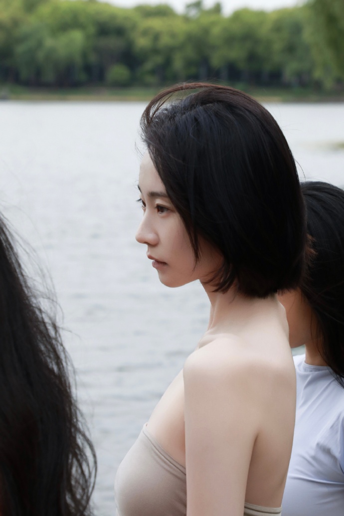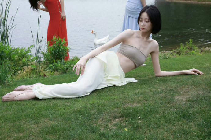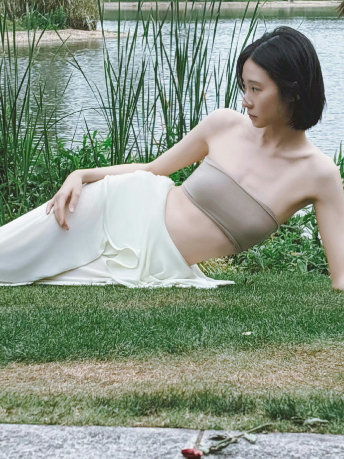 再看张艺凡本人,她的短发特别利落,在户外的微风里轻轻飘动,更添了几分灵动。她的五官很精致,眼神清澈又带着点疏离感,就像不食人间烟火的仙女。拍照的时候,她的姿势也很有范儿,躺在草地上,肢体舒展又优雅;站在水边,单手叉腰,气场直接拉满;还有对着镜头抬手的动作,又美又飒,每一个画面都像精心设计的艺术品。