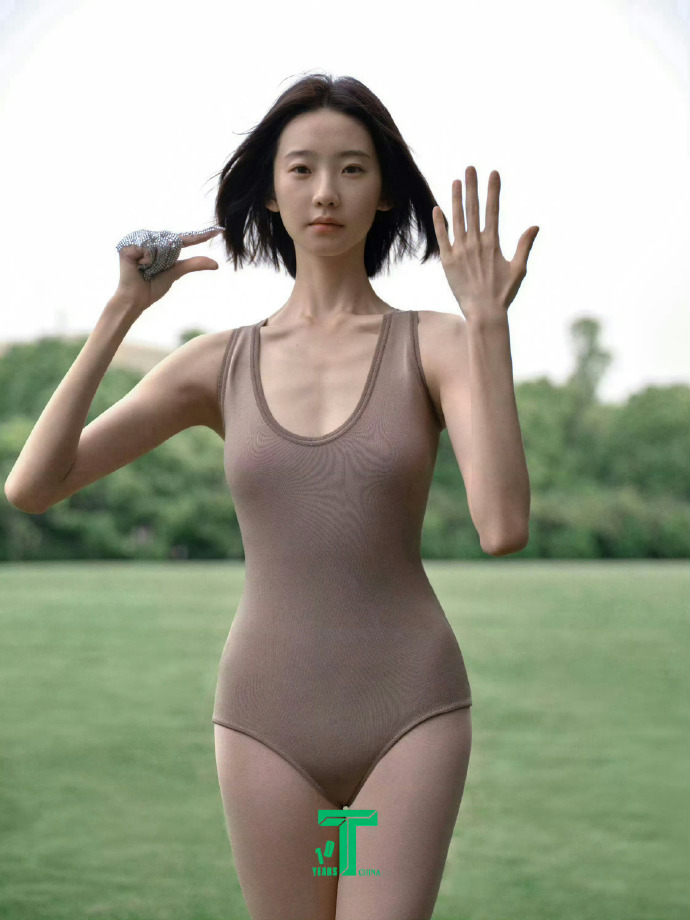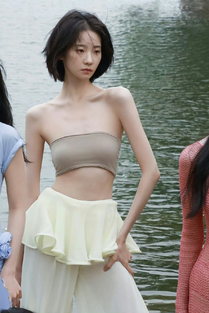 咱就是说,这次的造型真的太绝了。先看穿搭,有一套是裸色抹胸搭配奶油白的裙裤,抹胸把她优越的肩颈线和纤细的腰肢都露出来了,裙裤的材质轻盈又垂顺,走动间还带点飘逸感,就像林间的精灵一样。还有一身裸色的紧身连体衣,完美勾勒出她的身材曲线,简单却超有质感,把她那种清冷又高级的气质衬得恰到好处。