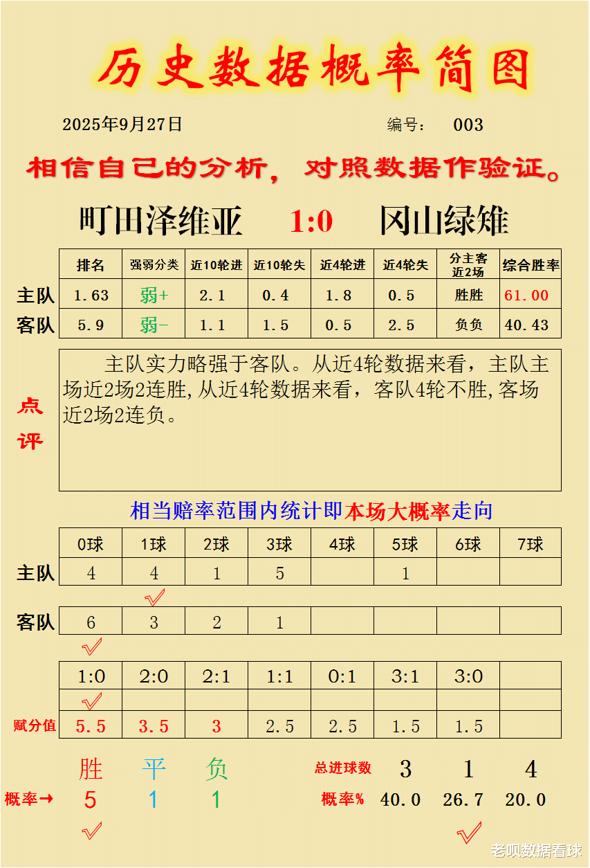 日职 主任编号:003 町田泽维亚VS冈山绿雉 终场赛果为1:0,主队胜,总进球数1个,复盘历史数据大概率与当期赛果的验证情况如下,仅供球友复盘参考及下次跟踪,如觉得我们作品值得跟踪记得点关注。