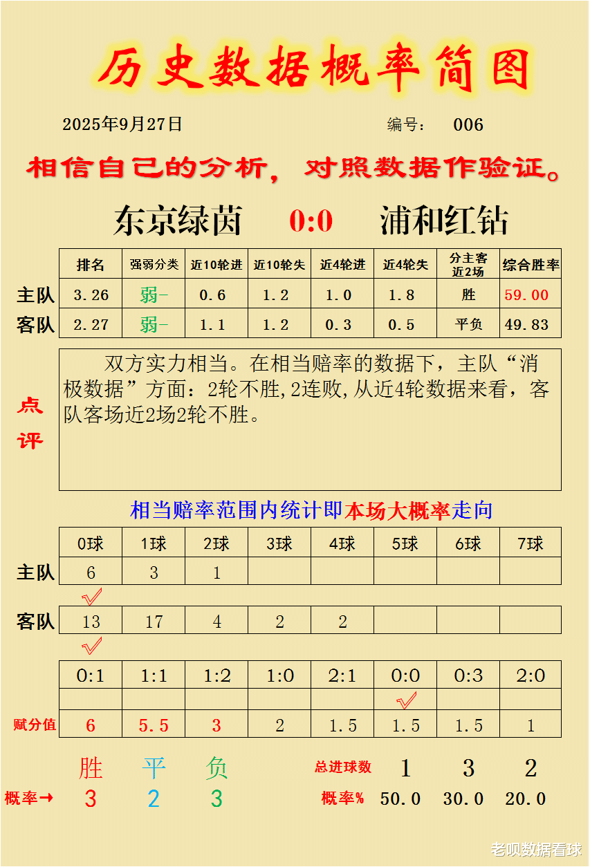 日职 主任编号:006 东京绿茵VS浦和红钻 终场赛果为0:0,双方握手言和,总进球数0个,复盘历史数据大概率与当期赛果的验证情况如下,仅供球友复盘参考及下次跟踪,如觉得我们作品值得跟踪记得点关注。