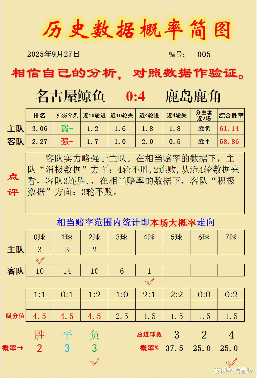 日职 主任编号:005 名古屋鲸鱼VS鹿岛鹿角 终场赛果为0:4,客队胜,总进球数4个,复盘历史数据大概率与当期赛果的验证情况如下,仅供球友复盘参考及下次跟踪,如觉得我们作品值得跟踪记得点关注。