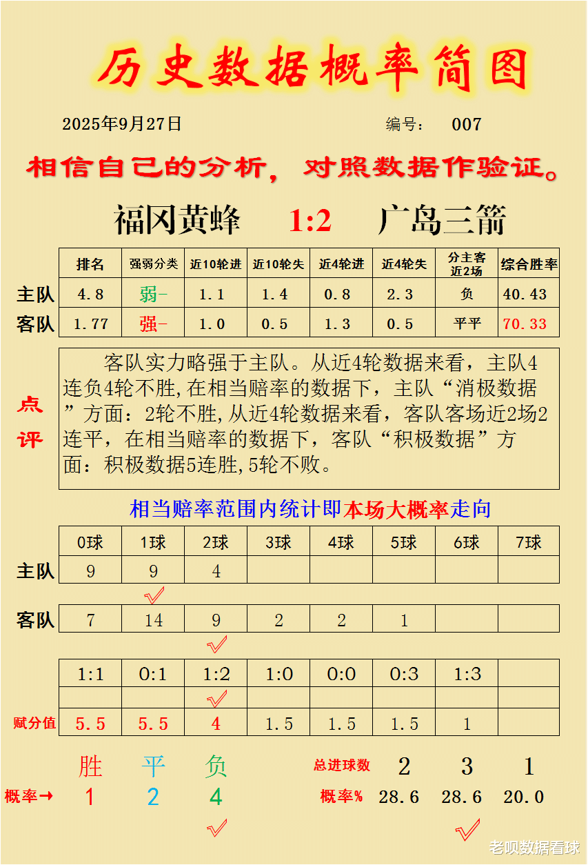 日职 主任编号:007 福冈黄蜂VS广岛三箭 终场赛果为1:2,客队胜,总进球数3个,复盘历史数据大概率与当期赛果的验证情况如下,仅供球友复盘参考及下次跟踪,如觉得我们作品值得跟踪记得点关注。