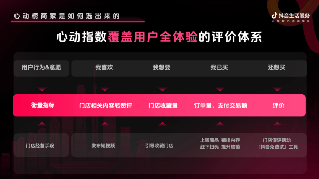 根据抖音生活服务最新披露的评价体系,「心动榜」的影响因子包括门店相关内容的转评赞、被收藏的次数、订单支付量、评价和复购率等等,如果用时下流行的大模型来打比方,「心动榜」是覆盖范围最大的模型。